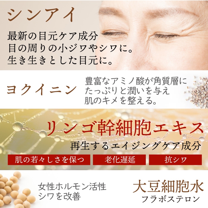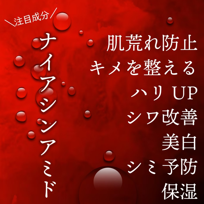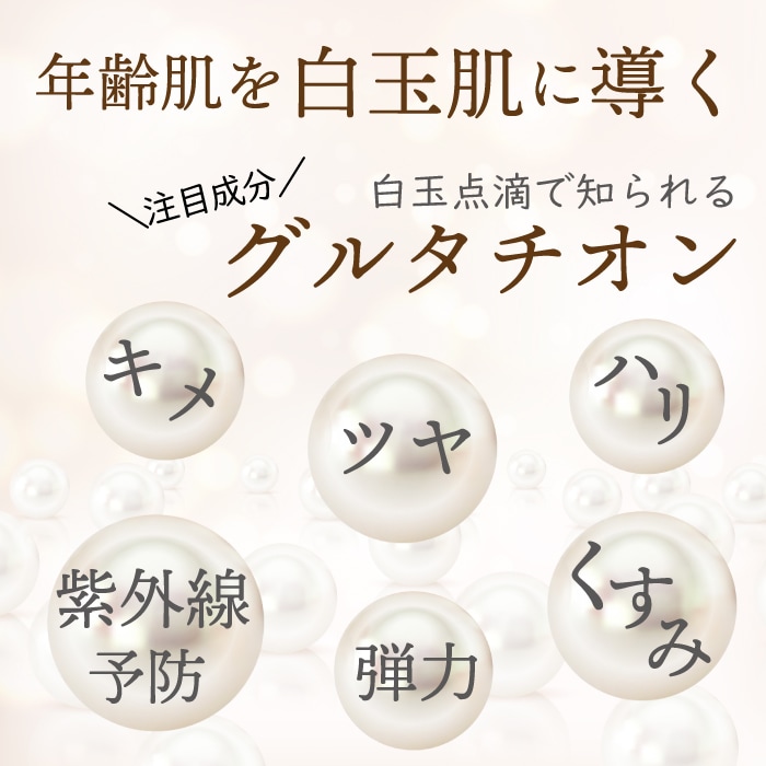強力な抗酸化作用と、老化の一因である活性酸素を還元、解毒効果のあるグルタチオンや抗酸化、肌バリア機能強化が期待できるナイアシンアミド、女性ホルモン活性化に効果が期待できる3種の成分を高配合しました。